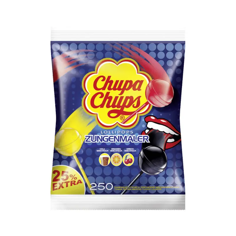 Chupa Chups Tongkleurders 250 stuks zijn fruitig-pittig lolly’s die vlekken op je tong maken als je erop zuigt.