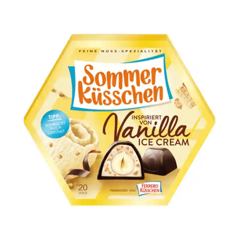 Laat je verleiden door Ferrero Sommer Küsschen, een perfecte zomerse traktatie. Elke hap begint met een knapperige hele hazelnoot, omhuld door een fluweelzachte vanillecrème, geïnspireerd door heerlijk verfrissend vanille-ijs. De delicate balans wordt afgerond met een laagje fijne melk- en halfbittere chocolade, waardoor de smaakbeleving zowel rijk als verfijnd is. Geniet van het ultieme zomermoment met deze onweerstaanbare lekkernij!