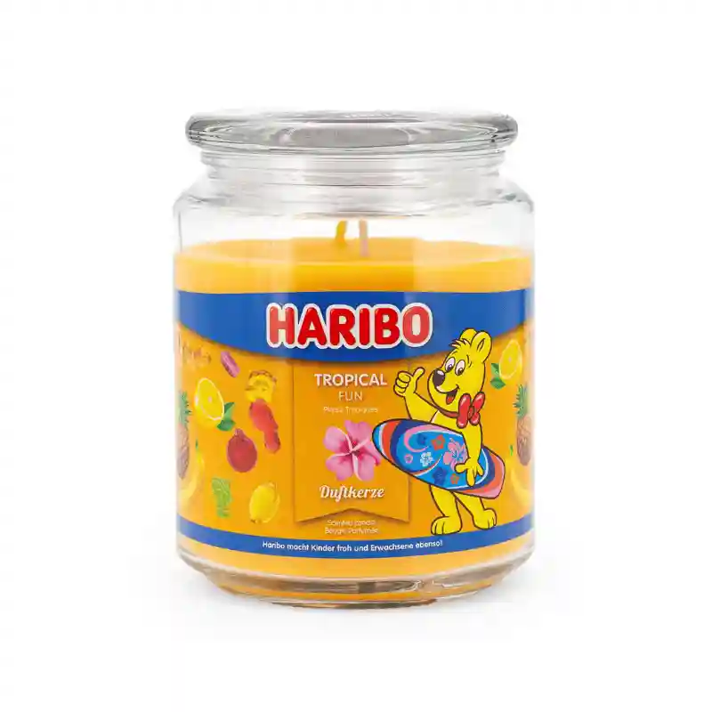 Breng de tropische vibes rechtstreeks in je huis met de Haribo Geurkaars Tropical Fun 510g  .