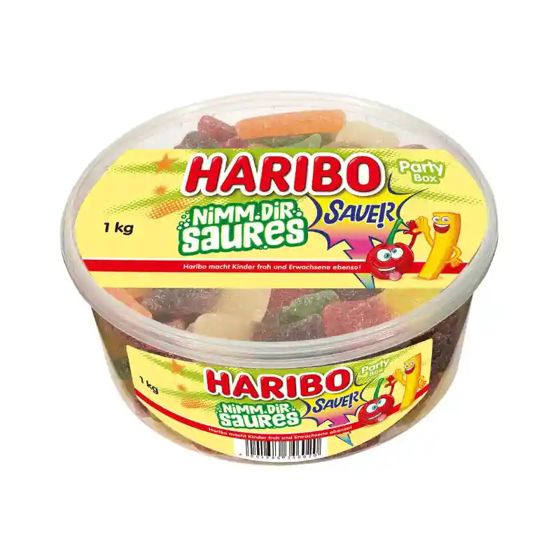 Haribo Nimm Dir Zuur is een mengsel van verschillende, zure gekonfijte fruitkauwgomstukjes.