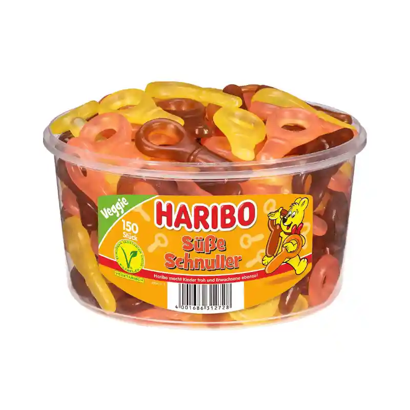 Haribo Sweet fopspeen veggie 150st hebben de verleidelijke smaak van de populaire limonadesoorten cola, citroen en sinaasappel.