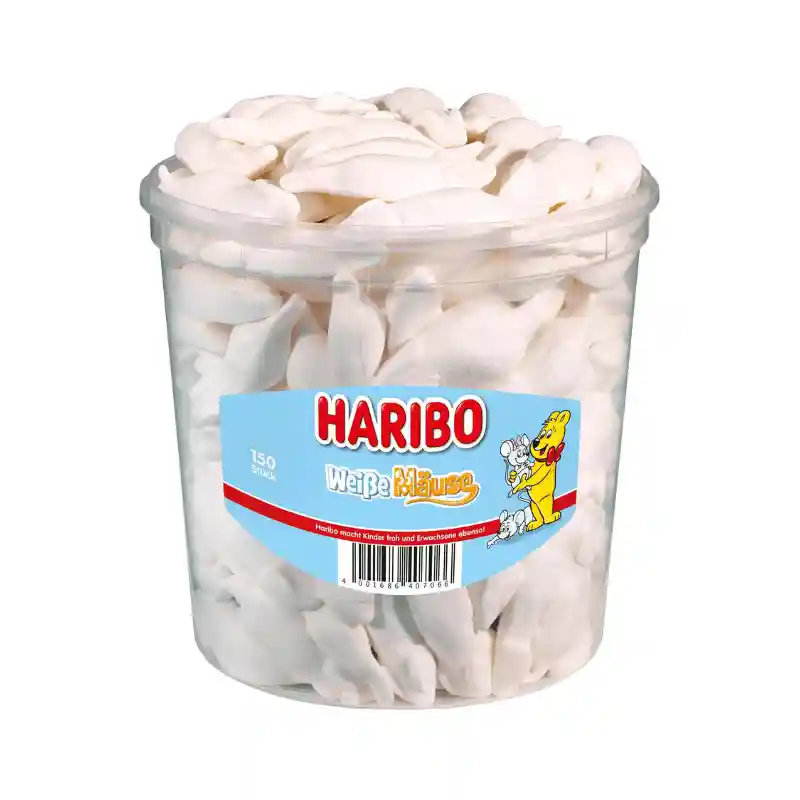 Haribo Witte Muizen zijn verse schuimsuikerhapjes in de smaak van sap sinaasappel,de perfecte traktatie voor elke snoepliefhebber!