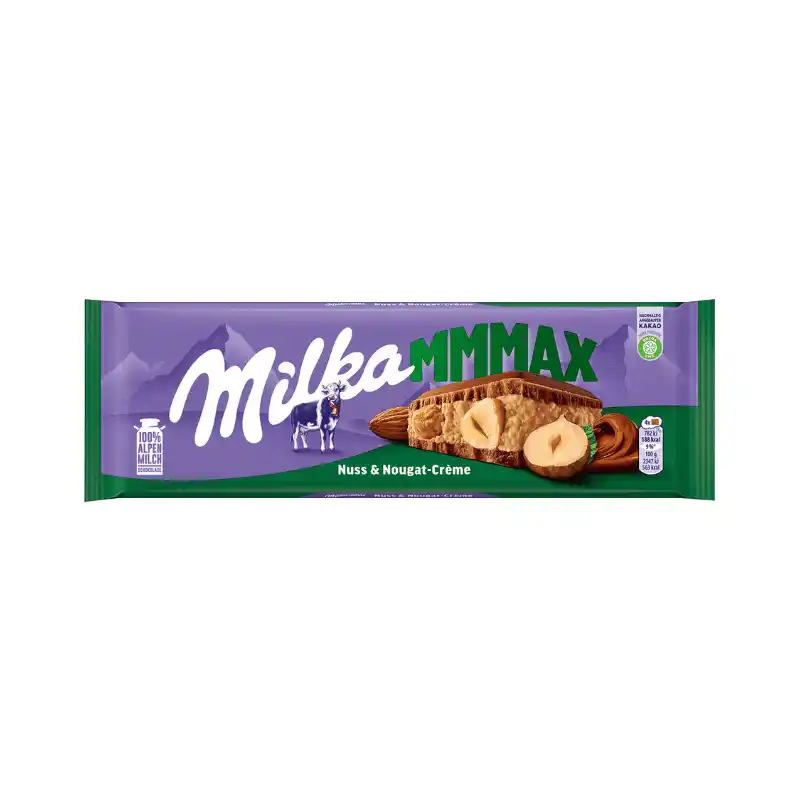 Milka mmmax noten & nougat creme 300g , is een XXL reep alpine melkchocolade met hele hazelnoten en nougatcrèmevulling.