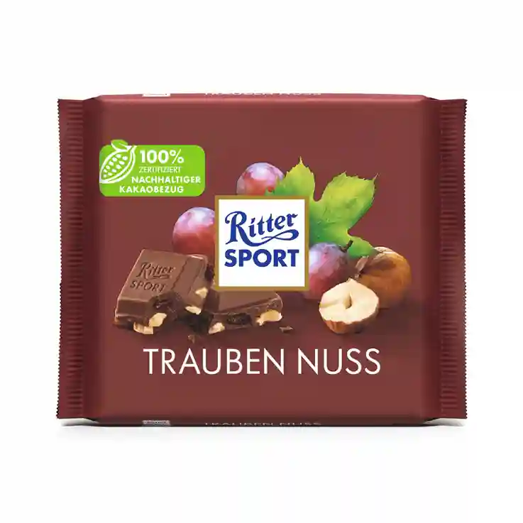 Ritter Sport Druif en Noot is de beproefde combinatie die staat voor knapperig-fruitig genieten.