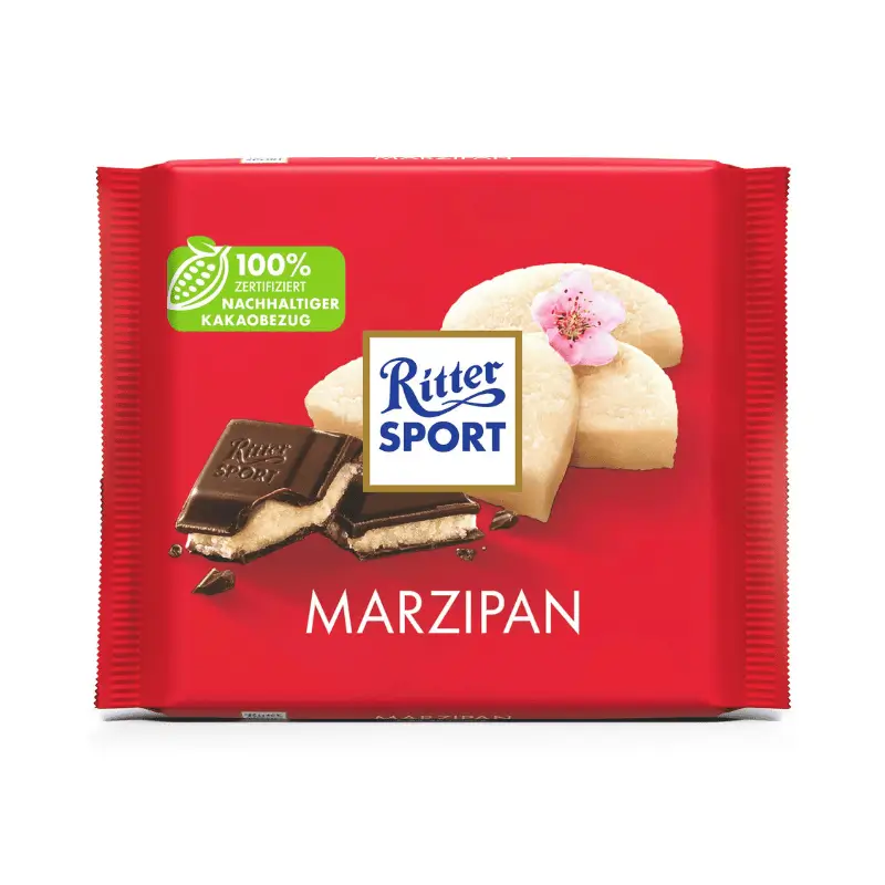 Ritter sport Marsepein 100gr is het hoekige culinaire genot voor liefhebbers van marsepein.