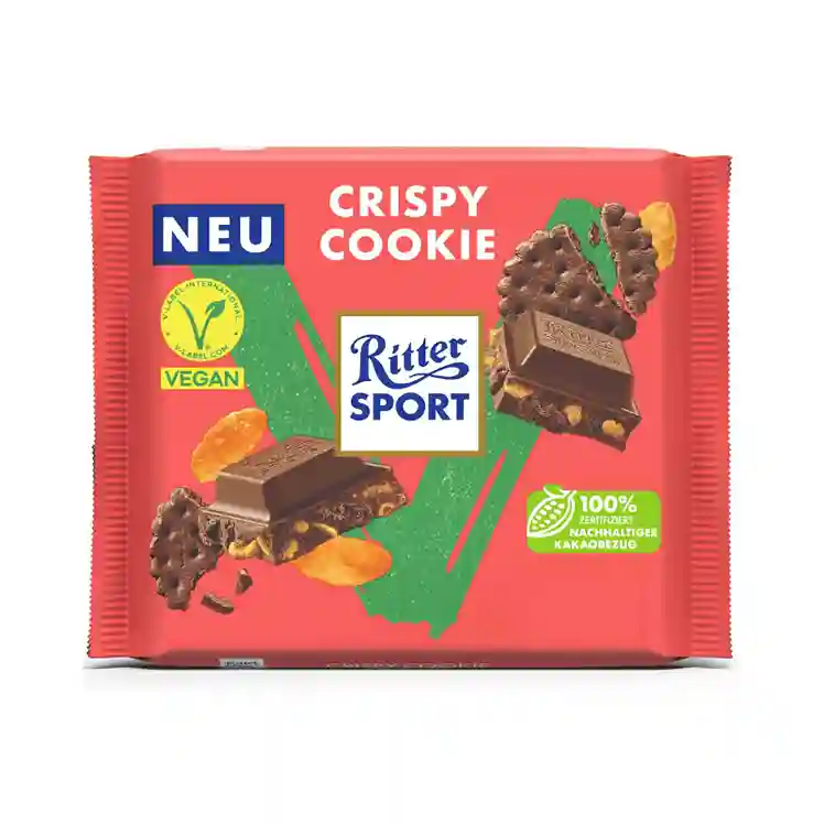 De heerlijke Ritter Sport Vegan Crispy Cookie verwent je met heerlijk chocoladegenot zonder dierlijke ingrediënten.