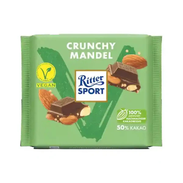 Ritter Sport Vegan Crunchy Amandel is een chocolade traktatie met knapperige amandelstukjes, die niet alleen veganisten inspireert.
