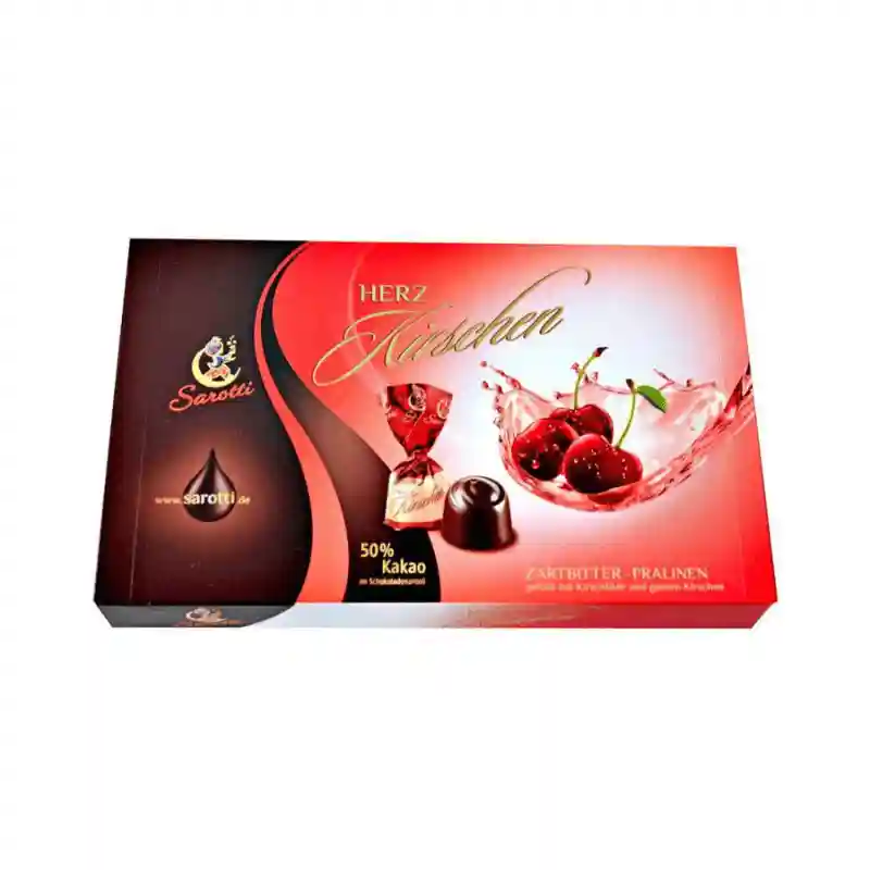 De Sarotti Kersenlikeur pralines zijn een luxueuze traktatie die de rijke traditie van het maken van chocolade en de heerlijke smaak van kersenlikeur samenbrengt. Elegant verpakt in een doos van 250 g, zijn deze pralines perfect om cadeau te doen of om van te genieten als persoonlijke verwennerij.