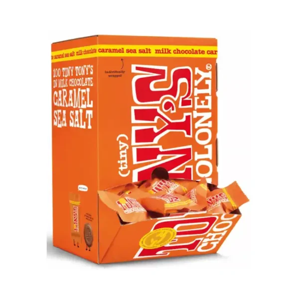 Geniet van een heerlijke symfonie van smaken met Tony’s Chocolonely Tiny’s Melk Karamel Zeezout, een verleidelijke traktatie die